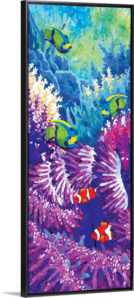 <p>Contemporary colorful painting of a tropical fish swimming around a coral reef.</p>