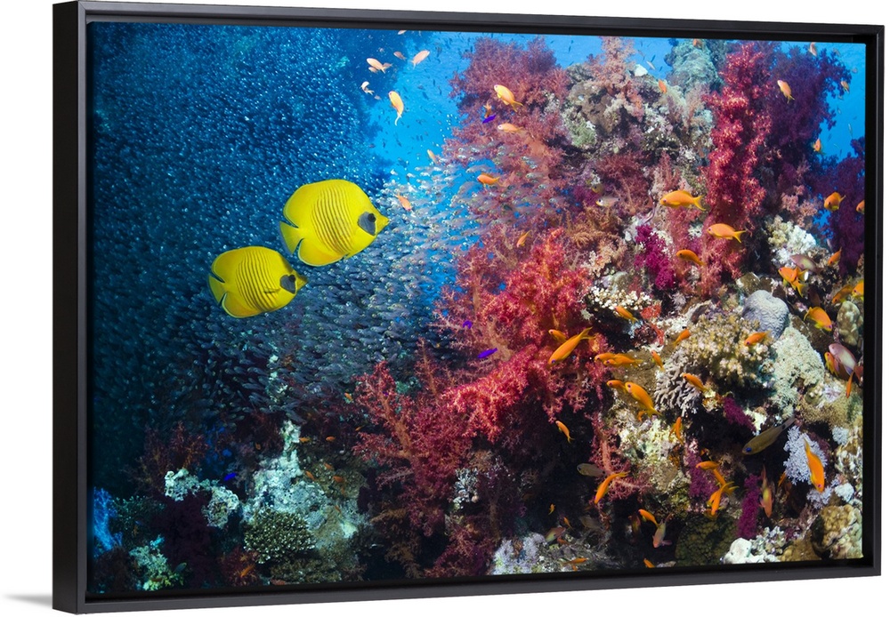 <p>Coral reef scenery with a pair of Golden butterflyfish (Chaetodon semilarvatus), soft corals (Dendronephthya sp), and Pygmy sweepers (Parapriacanthus guentheri). Egypt, Red Sea.</p>