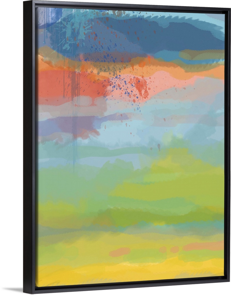 <p>Abstract contemporary painting in layers of blue, coral, green, and yellow, resembling a sunset sky.</p>