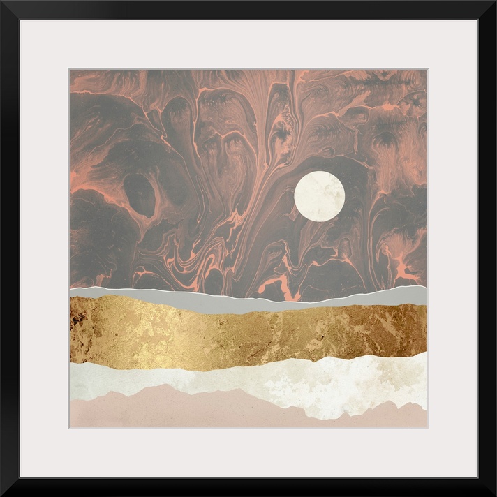 <p>Abstract depiction of a landscape with grey, gold, pink and yellow.</p>