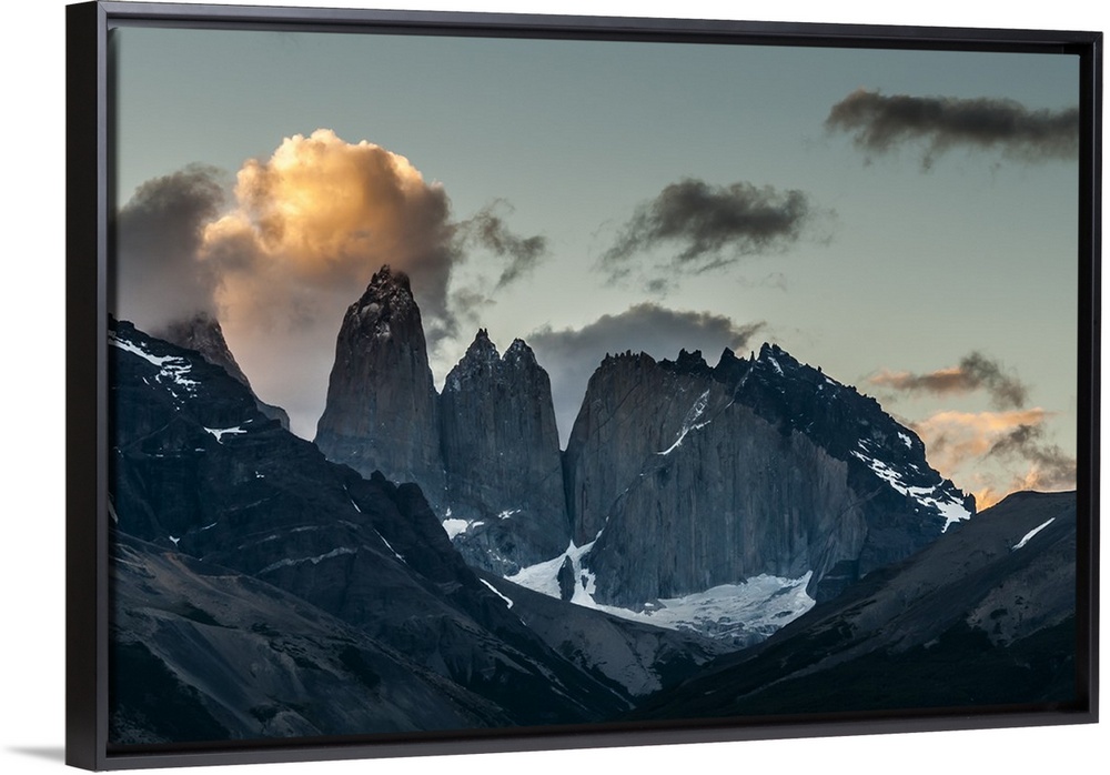 <p>Photograph of mountain spires in South America cast in shadow, with illuminated clouds in the sky.</p>