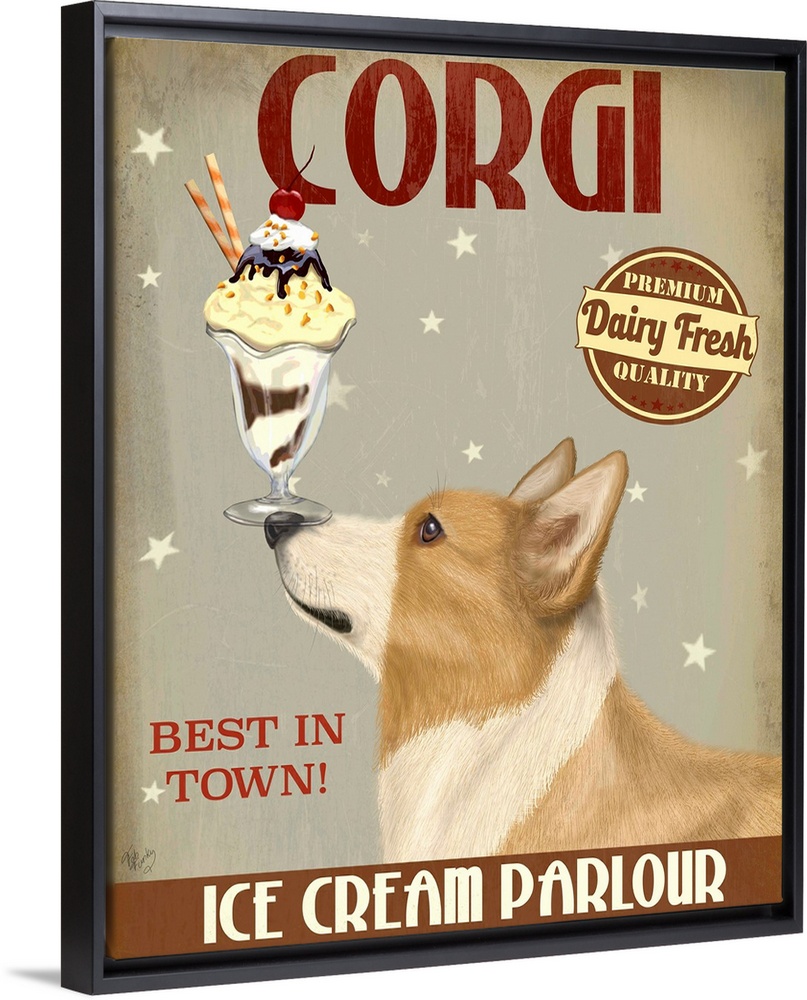 <p>Decorative artwork of a Corgi balancing an ice cream sundae on its nose in an advertisement for an ice cream parlour.</p>