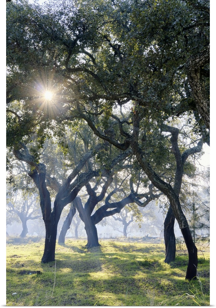 <p>Cork trees in a misty morning. A forest (montado) near Palmela, Portugal.</p>