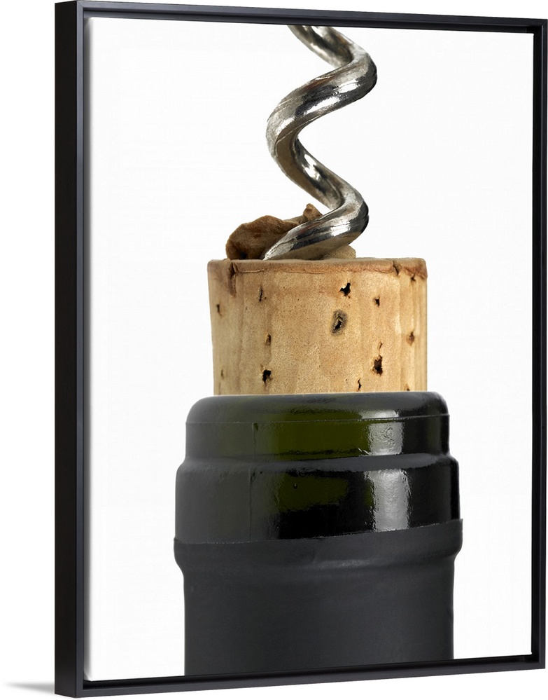 <p>Corkscrew and cork, photographed on white surface. Part of the bottle's neck can be seen too. The frame of the photograph is vertical.</p>
