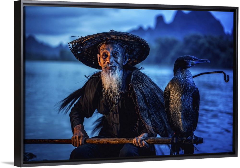 <p>Cormorant Fisherman Showing His Birds On Li River Near Xingping, Guangxi Province, China</p>