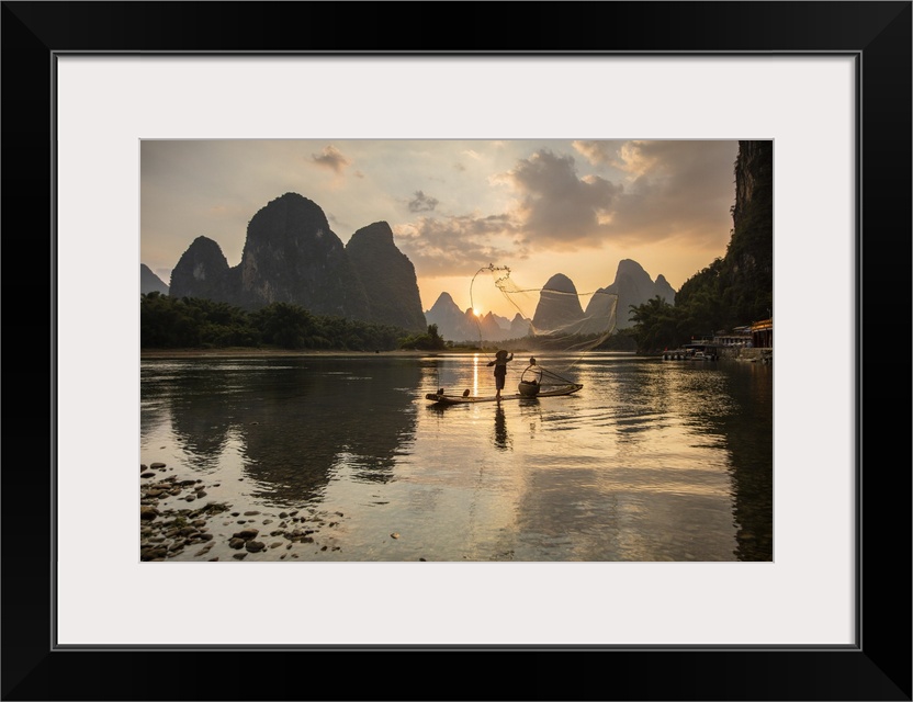 <p>Cormorant fisherman throwing net on Li River at dawn, Xingping, Yangshuo, Guangxi, China</p>