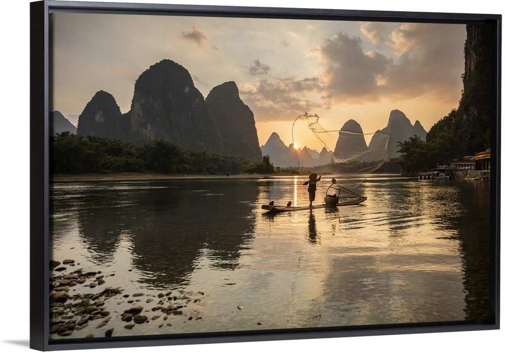 <p>Cormorant fisherman throwing net on Li River at dawn, Xingping, Yangshuo, Guangxi, China</p>