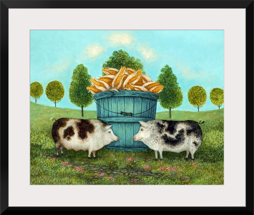 <p>A contemporary folk art painting of two spotted hogs standing by a blue wooden bucket filled with corn.</p>