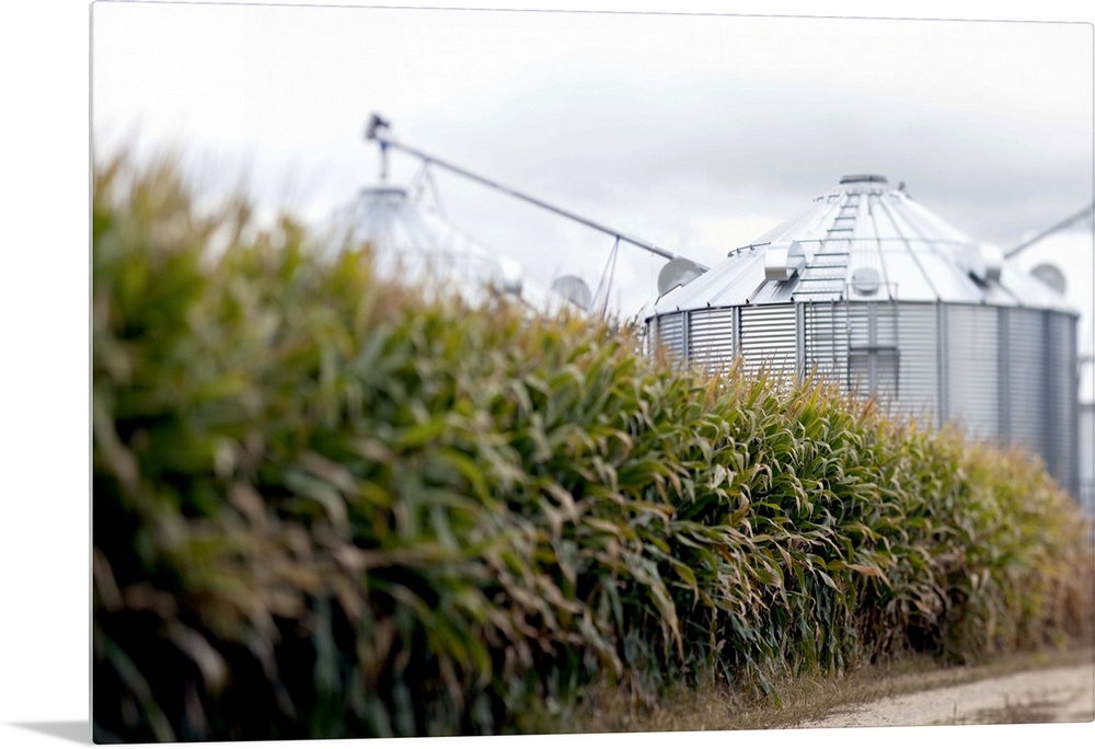 <p>Storage and drying bins tower over a field of corn in Wisconsin.</p>