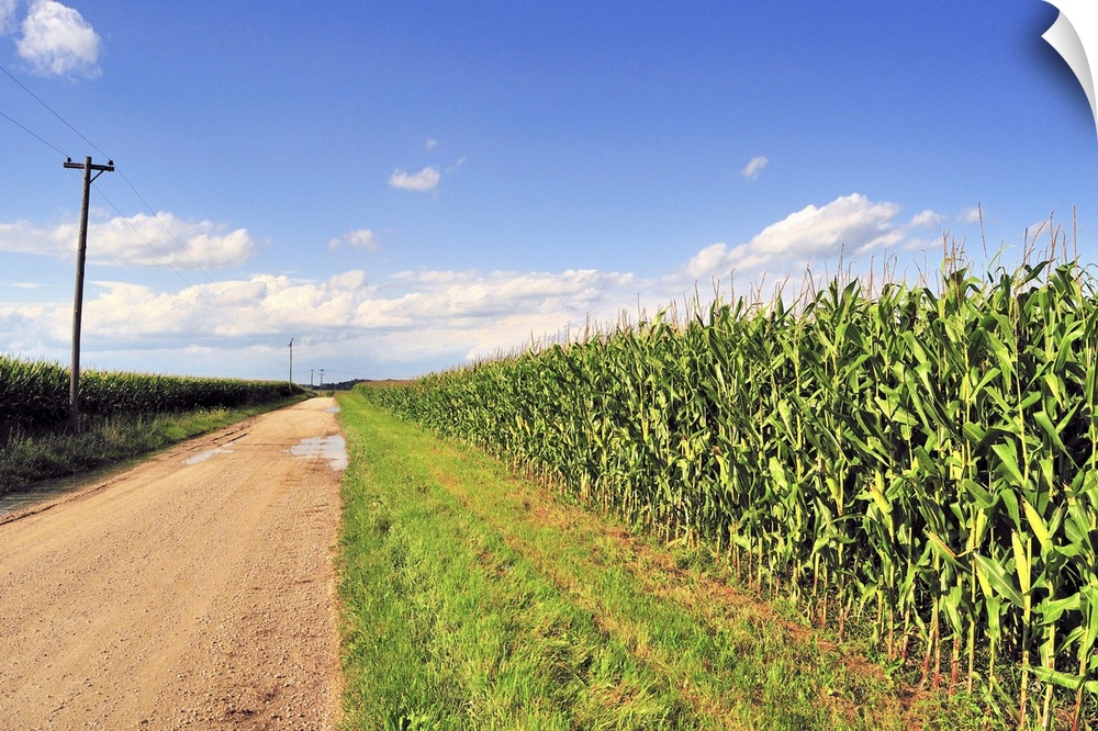 <p>Mature corn (Zea mays) in Illinois fields stretch to the horizon on both sides of a rural, dirt road. Illinois is the country's second largest grower of corn, trailing only Iowa in total production.</p>