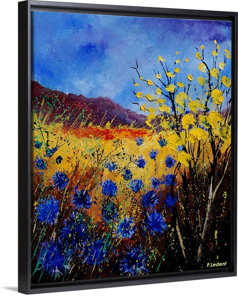 <p>Contemporary painting of a field of cornflowers in blue, yellow and orange.</p>