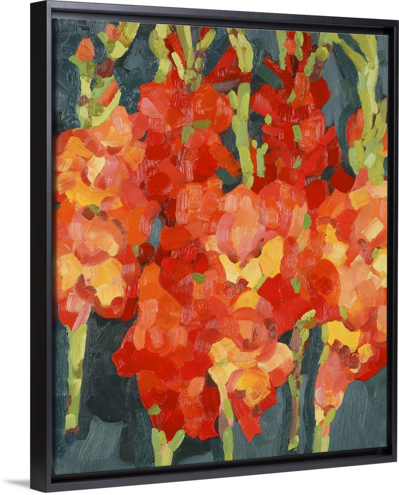 <p>Large, vertical, floral painting of a bunch of fiery colored gladiola on a dark background. Painted with thick, short brushstrokes and very little detail.</p>