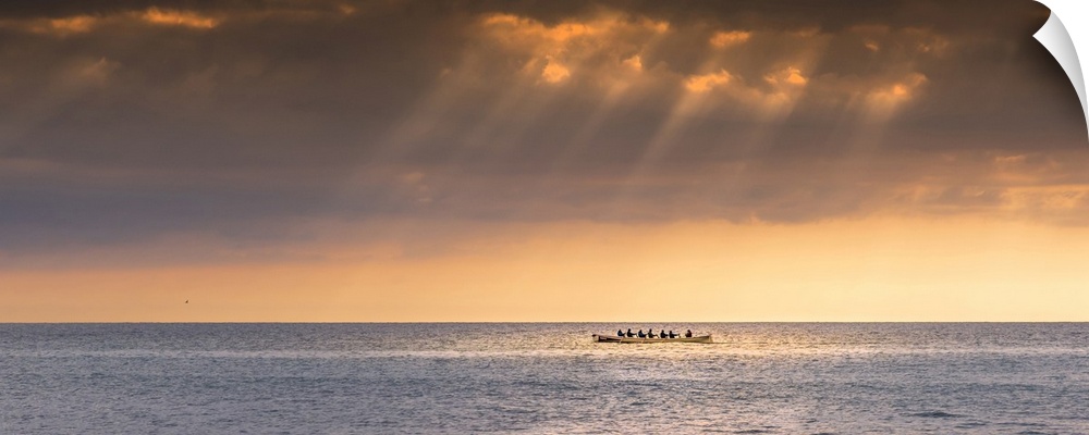 <p>A panoramic image of the 200 year old Cornish Pilot Gig Dove being rowed as the sun sets over Fistral bay in Newquay in Cornwall.</p>