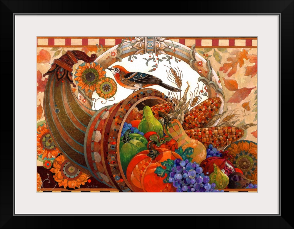 <p>Contemporary artwork of a cornucopia filled with harvest fruits and vegetables.</p>
