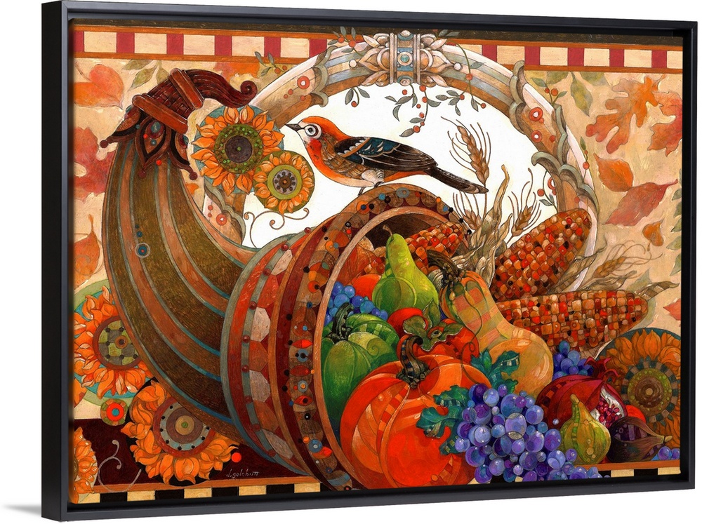 <p>Contemporary artwork of a cornucopia filled with harvest fruits and vegetables.</p>