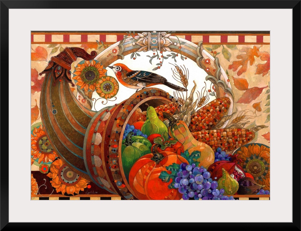 <p>Contemporary artwork of a cornucopia filled with harvest fruits and vegetables.</p>
