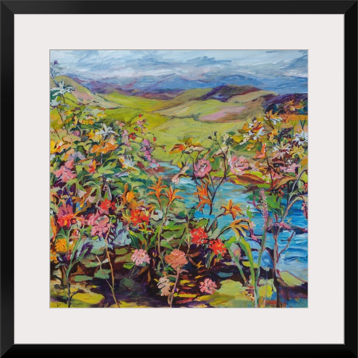 <p>Contemporary impressionist painting with colorful flowers and fruit in a landscape.</p>