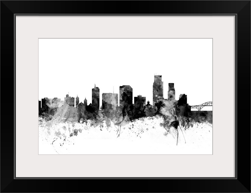 <p>Contemporary artwork of the Corpus Christie city skyline in black watercolor paint splashes.</p>