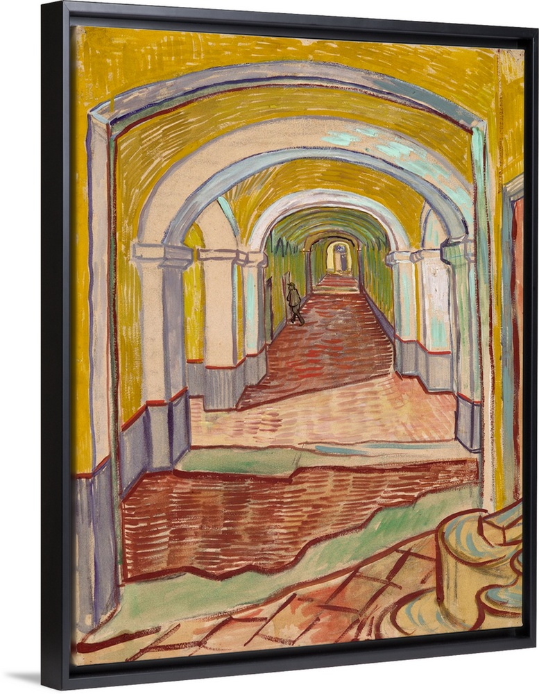 <p>This haunting view of a sharply receding corridor is the artist's most powerful depiction of the asylum of Saint-Paul-de-Mausole in St. Remy, where he spent twelve months near the end of his life and where he painted the Museum's oils of olive groves, cypresses, roses, and irises (Women Picking Olives; Olive Orchard; Cypresses; Wheat Field with Cypresses; Irises; Vase of Roses). The buildings (largely remains of a twelfth-century monastery) were divided into men's and women's wards, but most of the small cells looking out on the neglected garden were empty when Van Gogh was there. One of the rooms he was able to use as a studio.</p>