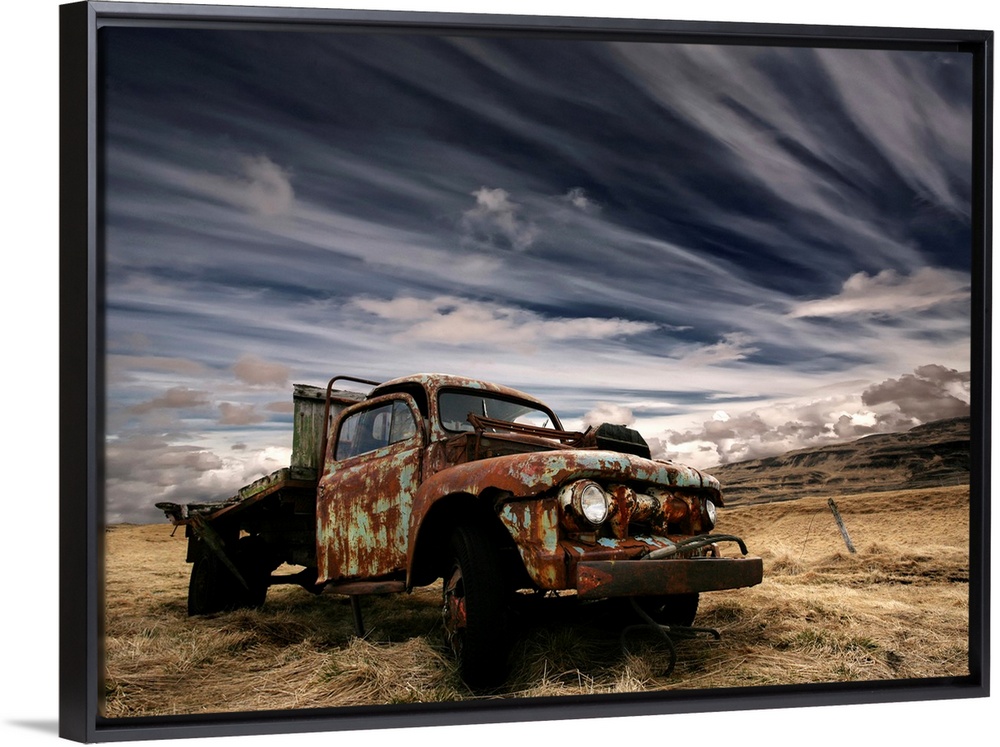 <p>An old rusted truck sits unused in a field under a sky with dramatic clouds.</p>