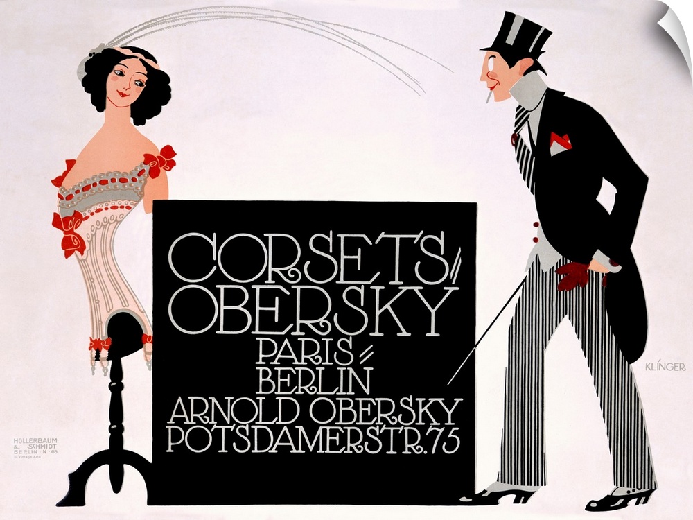 <p>Man staring at manequin. Klinger, a native of Vienna, was one of Berlin's best known posterists of the period 1900-1914, Germany's golden era of poster art. In fact he can be considered its clown prince: he contributed hundreds of illustrations to humor magazines and brought his sense of humor abundantly to his poster work as well. In this deliciously whimsical design for a Berlin corset maker, he lets the mannequin's ridiculously long hat-feather lead our eye to the gentleman who is gazing at the merchandise with a voyeuristic gleam.</p>