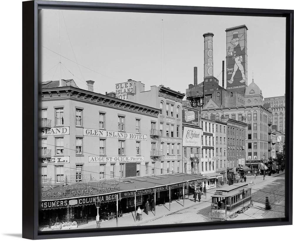<p>View of trolley passing Glen Island Hotel on Cortlandt Street.</p>