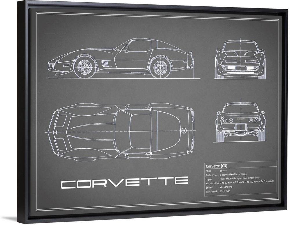 <p>Antique style blueprint diagram of a Corvette C3 printed on a Grey background.</p>