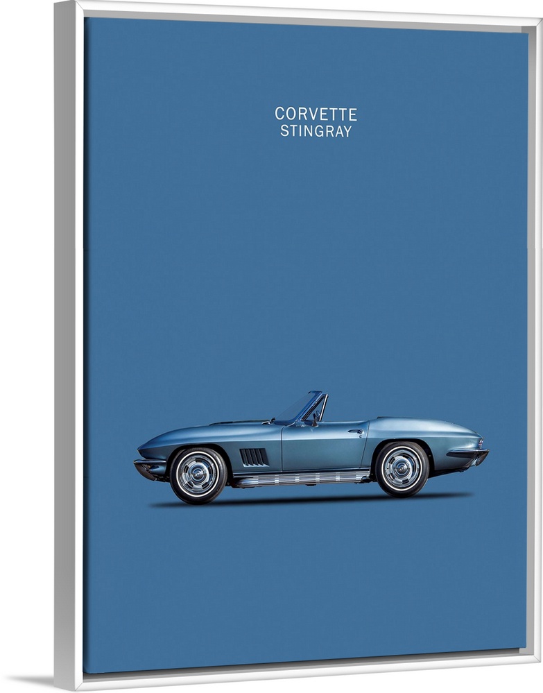 <p>Photograph of a blue Corvette Stingray 1967 printed on a blue background</p>