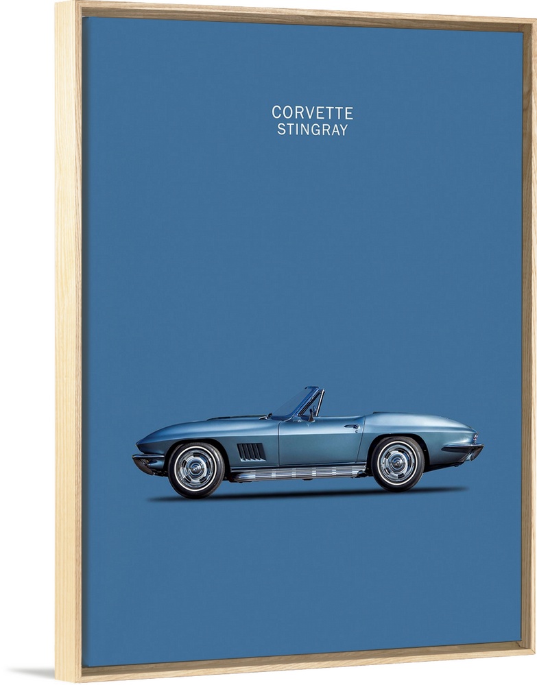 <p>Photograph of a blue Corvette Stingray 1967 printed on a blue background</p>