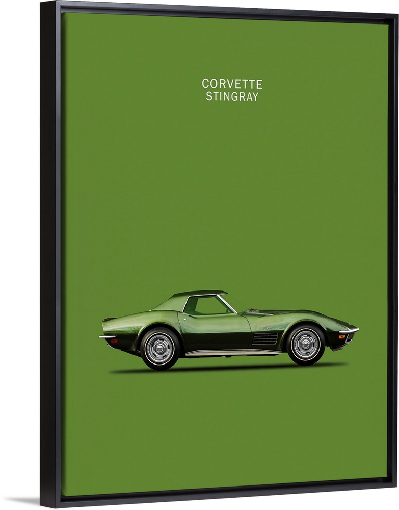 <p>Photograph of a dark green Corvette Stingray 1970 printed on a green background</p>