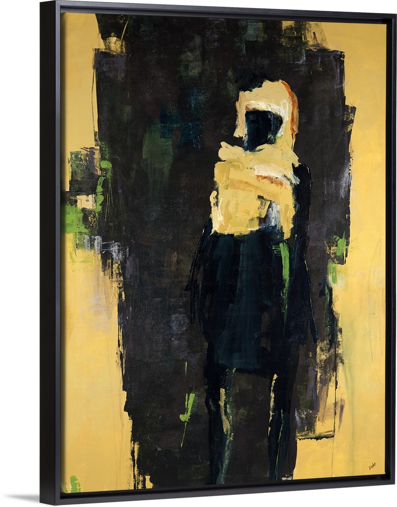 <p>Abstract painting of a cosmic figure stepping out of a black mass of thickly painted brushstrokes, on a golden background.</p>