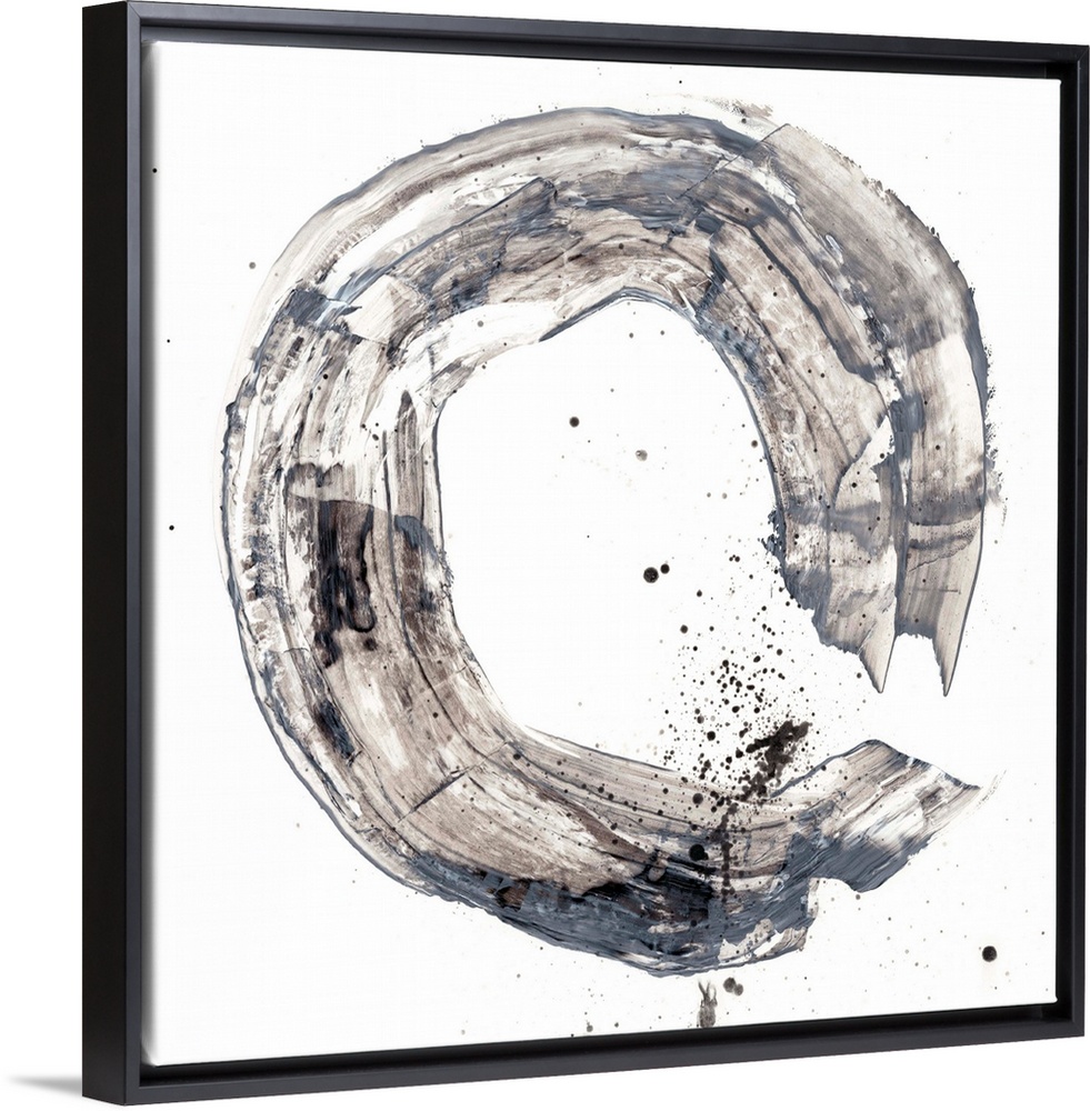 <p>Abstract painting of a circular shape in a wide gray brush stroke with overlaying splatters of black.</p>