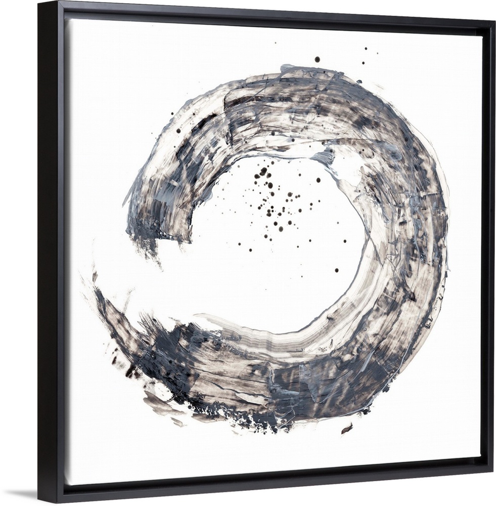 <p>Abstract painting of a circular shape in a wide gray brush stroke with overlaying splatters of black.</p>