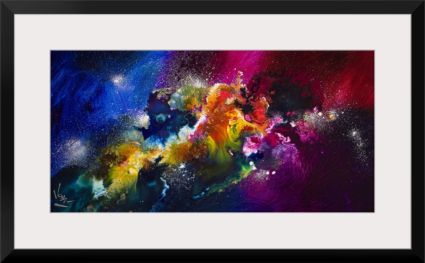 <p>Contemporary abstract painting using a spectrum of color and spattered paint resembling a cosmic nebula.</p>