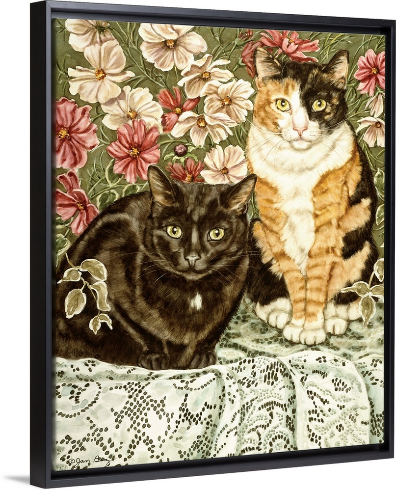 <p>Painting of two cats on a lacy tablecloth on a table with some flowers.</p>