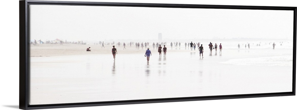 <p>Panoramic landscape photograph of a crowd of people walking on a white, blown out beach shore with a shallow depth of field in Spain.</p>