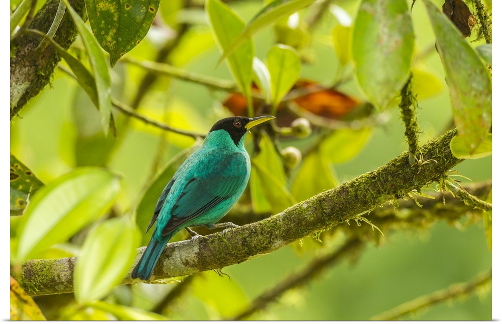 <p>Costa Rica, La Selva Biological Station. Green honeycreeper bird on limb. Credit: Cathy & Gordon Illg / Jaynes Gallery</p>