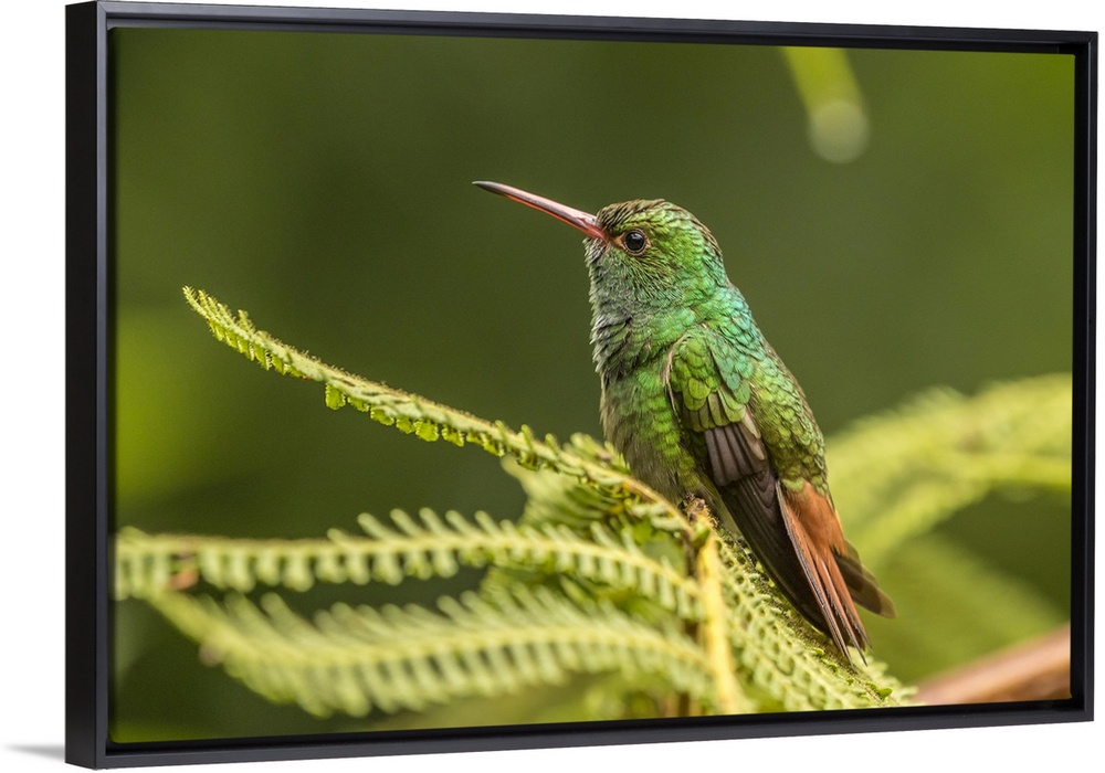 <p>Costa Rica, Sarapique River Valley. Rufous-tailed hummingbird on fern. Credit: Cathy & Gordon Illg / Jaynes Gallery</p>