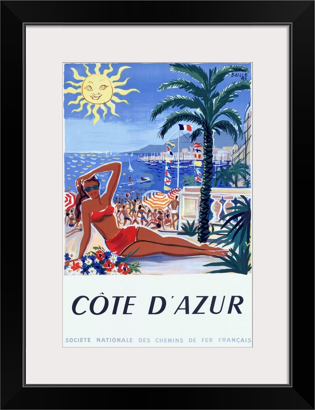 <p>Vintage artwork that shows a woman close up in a bathing suit with more people playing on the beach behind her. Palm trees and buildings line the right side with water to the left and an animated sun above.</p>