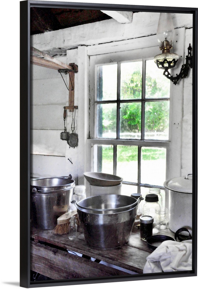 <p>Old oil light on whitewashed wood walls and paned glass kitchen window with stainless pots and pans on wooden table.</p>