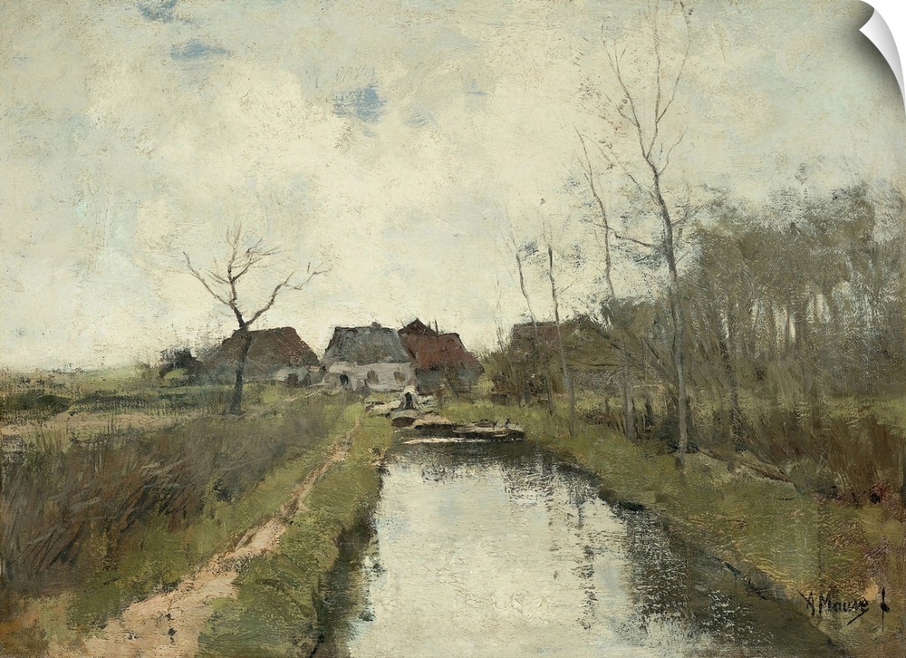 <p>Cottages near a Ditch, by Anton Mauve, 1870-88, Dutch painting, oil on canvas. Polder landscape in the low-lying land reclaimed from the sea in the Netherlands.</p>