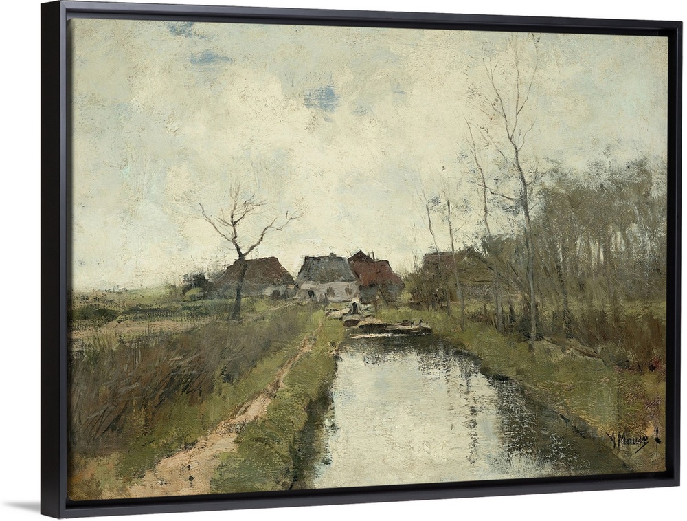 <p>Cottages near a Ditch, by Anton Mauve, 1870-88, Dutch painting, oil on canvas. Polder landscape in the low-lying land reclaimed from the sea in the Netherlands.</p>