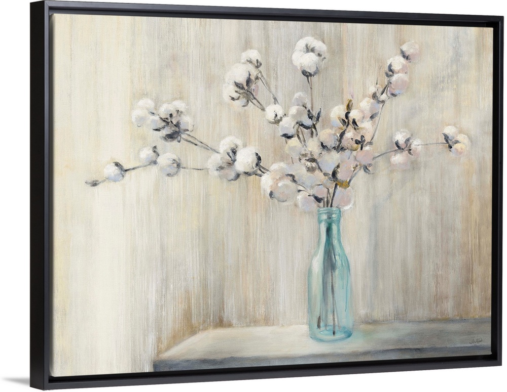 <p>Still life painting of a cotton bouquet in a glass bottle with a neutral colored background.</p>