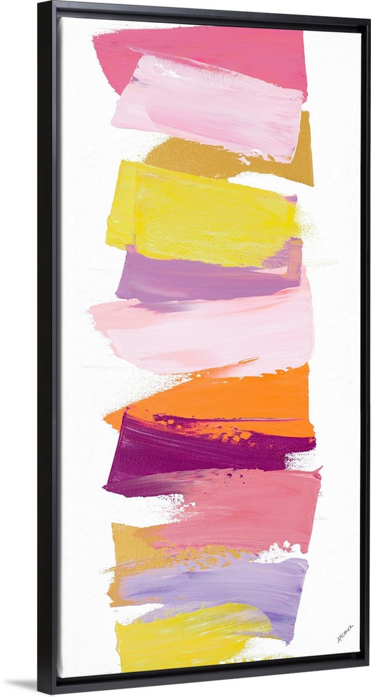<p>Vertical contemporary painting of shades of pink and yellow stacked in a line.</p>