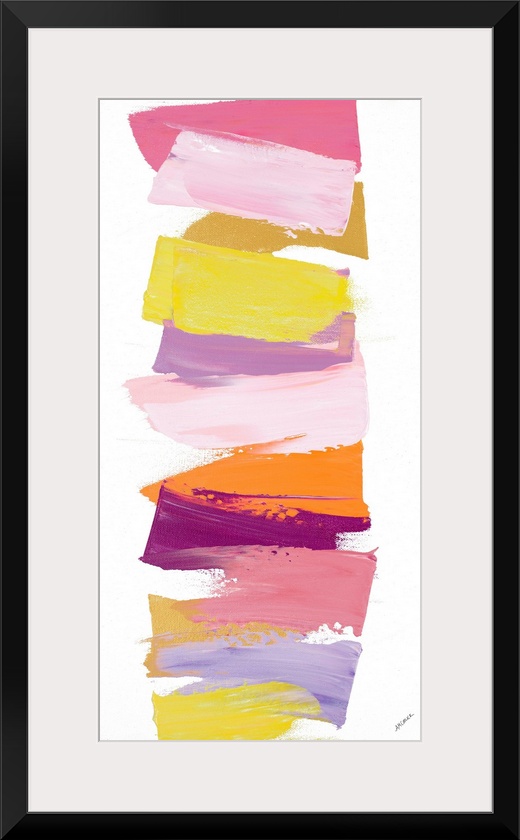 <p>Vertical contemporary painting of shades of pink and yellow stacked in a line.</p>