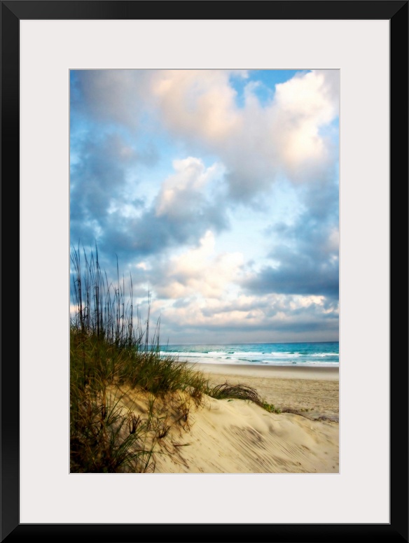 <p>Giant photograph taken of an ocean as it gently crashes into the sandy beach on a sunny day. Located in the foreground is a small mound of sand with tall grass on the top of it.</p>