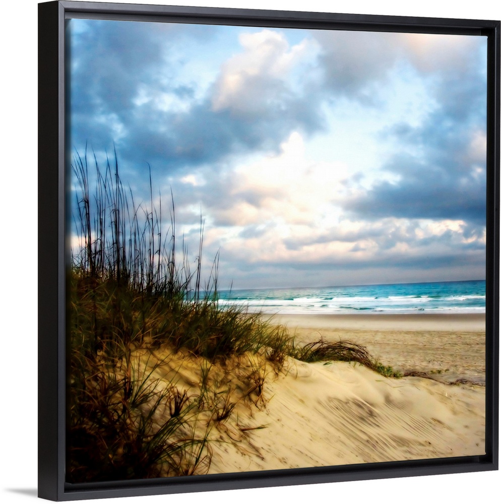 <p>Soft focus fine art photo of sand dune covered in reeds on the beach as blue water crashes on the sandy shore with light fluffy clouds up ahead.</p>