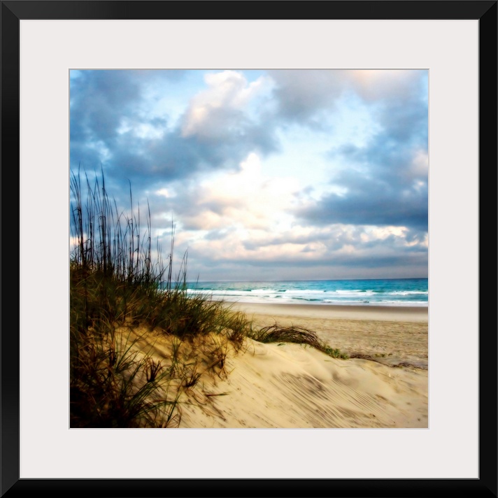 <p>Soft focus fine art photo of sand dune covered in reeds on the beach as blue water crashes on the sandy shore with light fluffy clouds up ahead.</p>