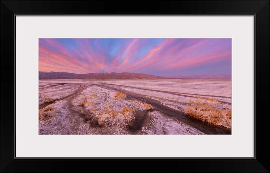 <p>Cottonball Basin salt flats, channels and Panamint Mountains at sunrise, Death Valley National Park, California, USA</p>