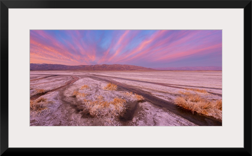 <p>Cottonball Basin salt flats, channels and Panamint Mountains at sunrise, Death Valley National Park, California, USA</p>